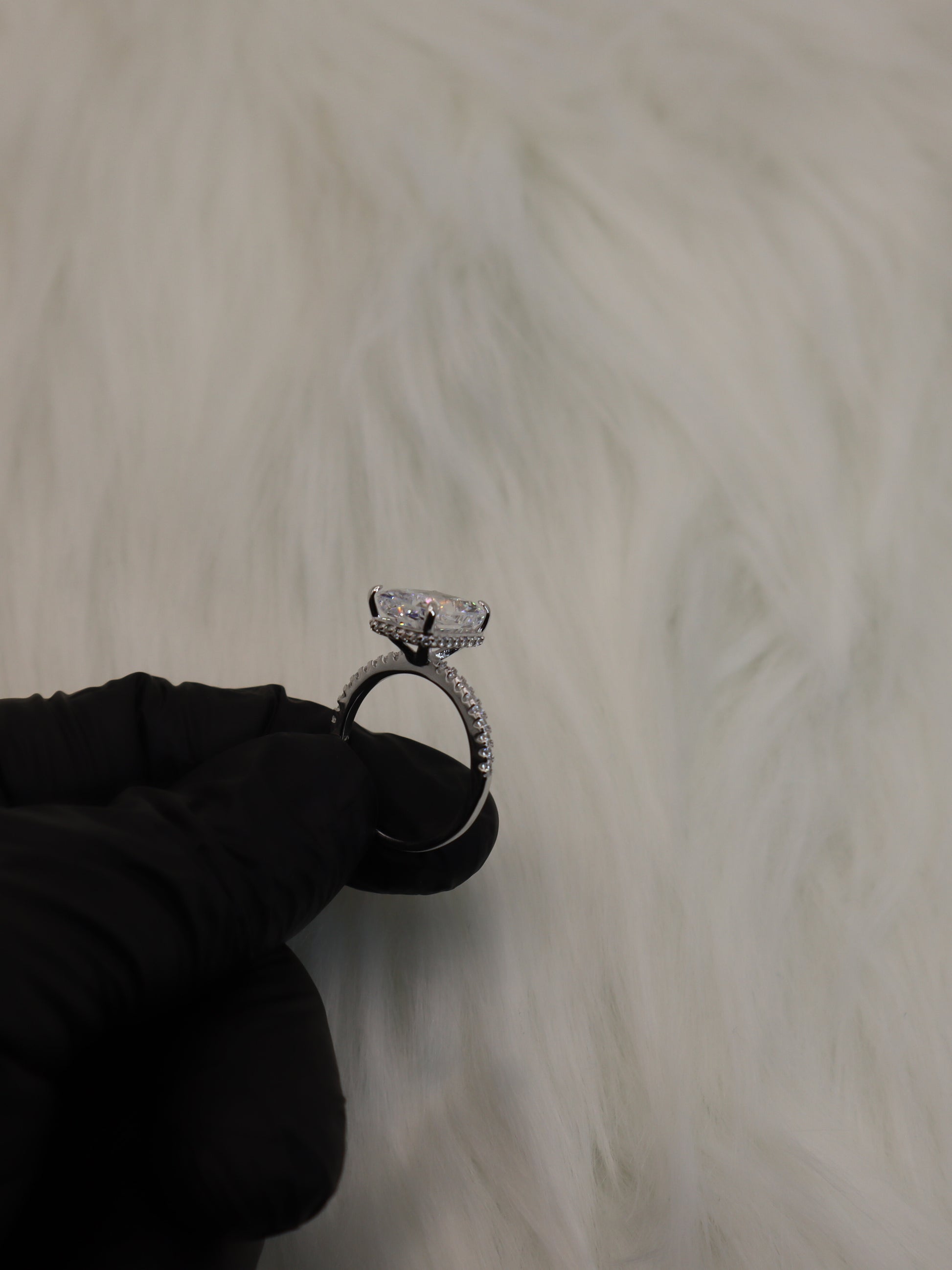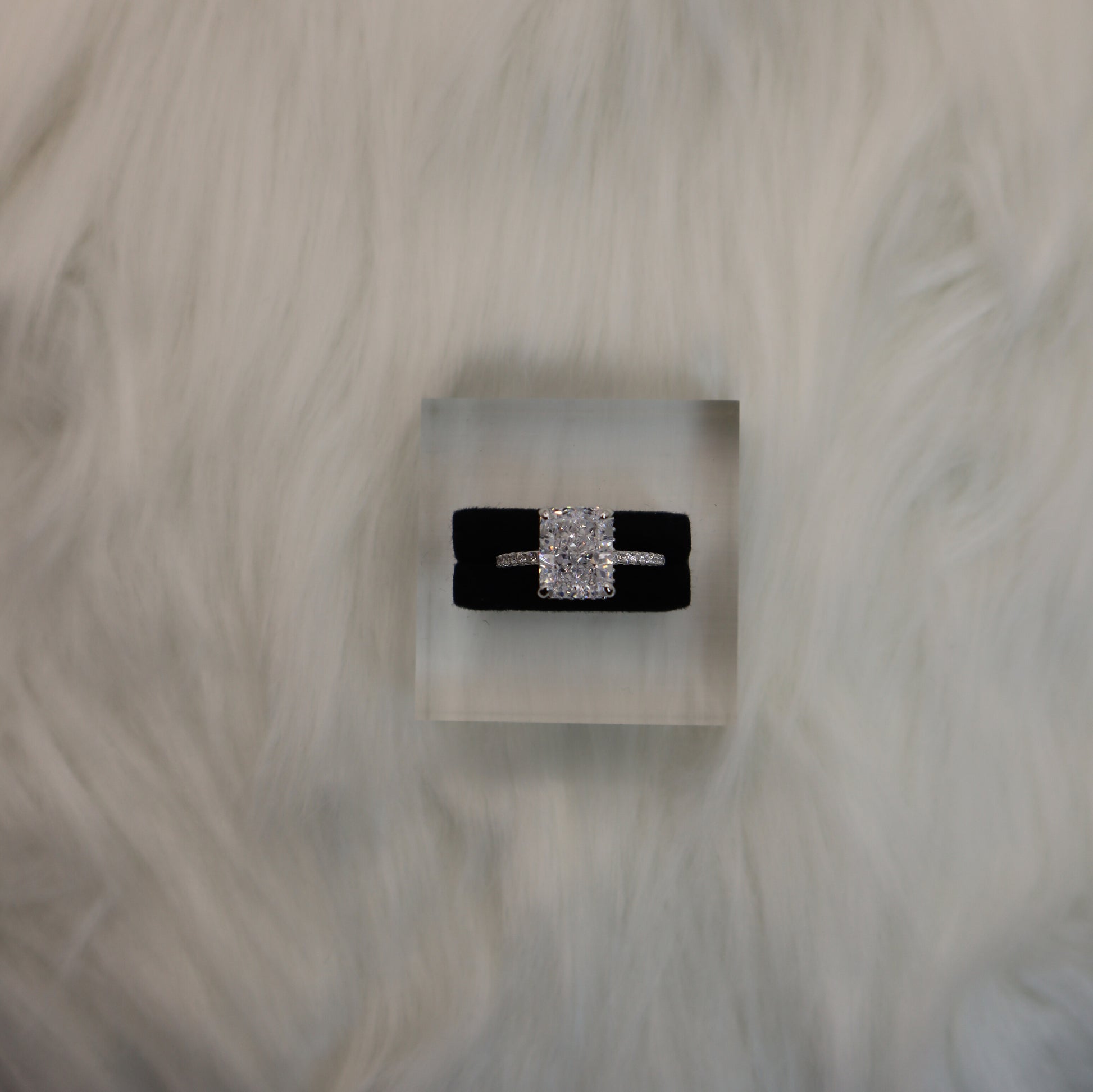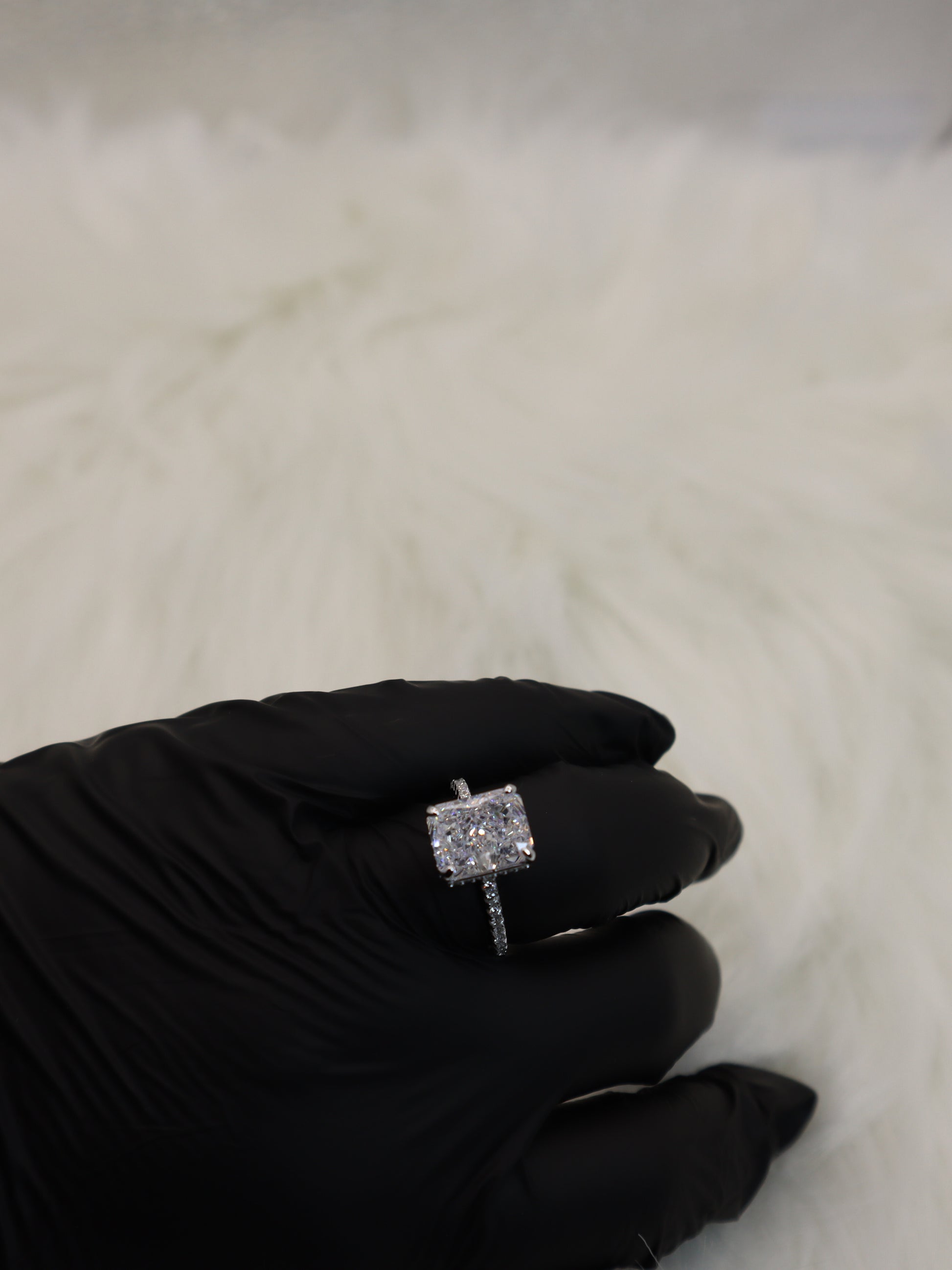 Elegant and luminous, the Luminara Ice Ring showcases a brilliant crushed-ice radiant-cut diamond-simulate stone set on a sleek pavé silver band. Designed for timeless sophistication, it reflects light with captivating sparkle from every angle.