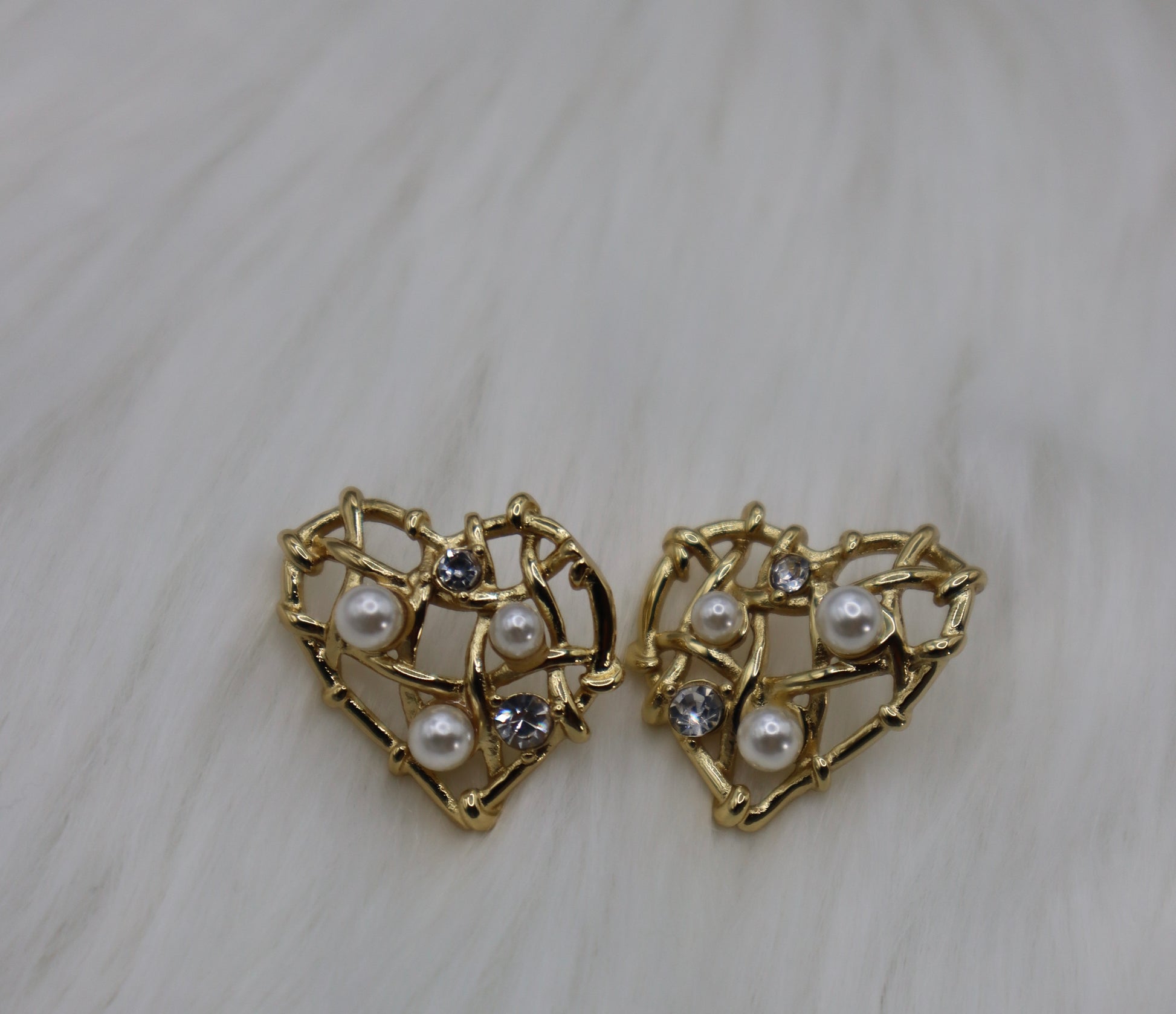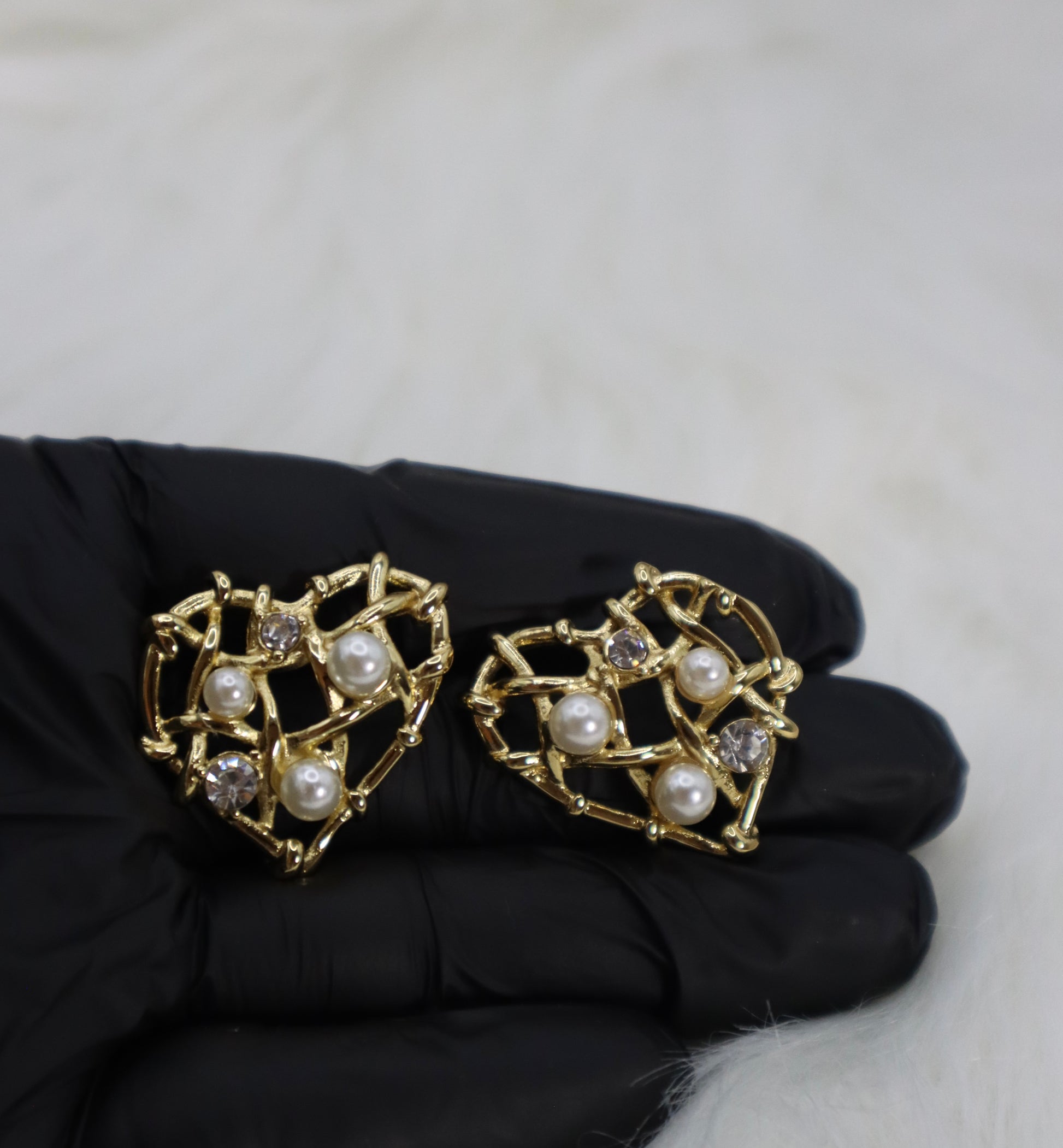 Openwork gold strands form a delicate heart-shaped lattice, accented with small pearls and sparkling crystals. Light and airy yet eye-catching, these earrings add a subtle touch of romance and shine to any outfit.