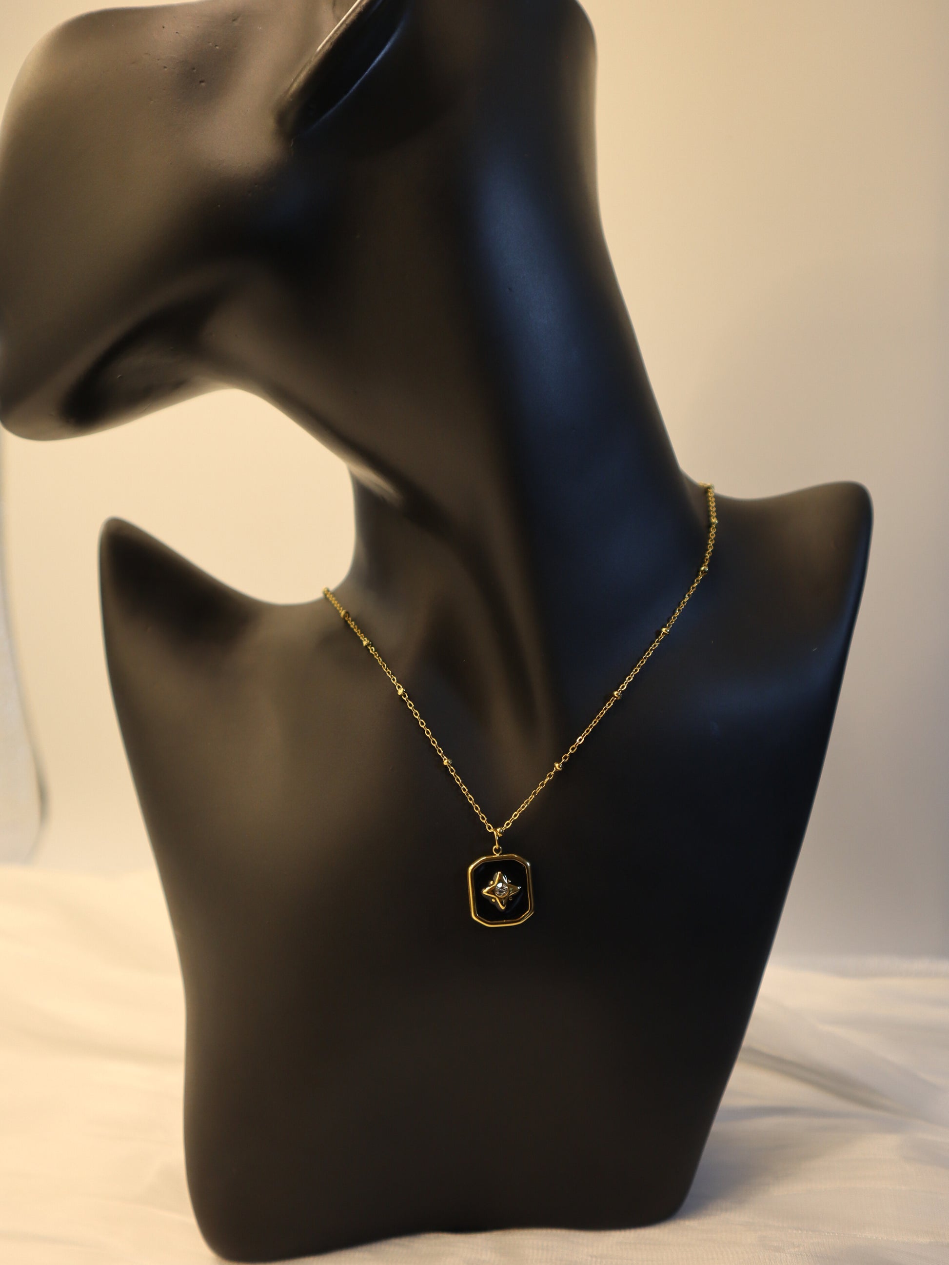 Framed in soft gold and set against deep black enamel, the North Noir Pendant features a star-shaped motif with a sparkling centre, a subtle symbol of guidance, clarity, and inner direction.