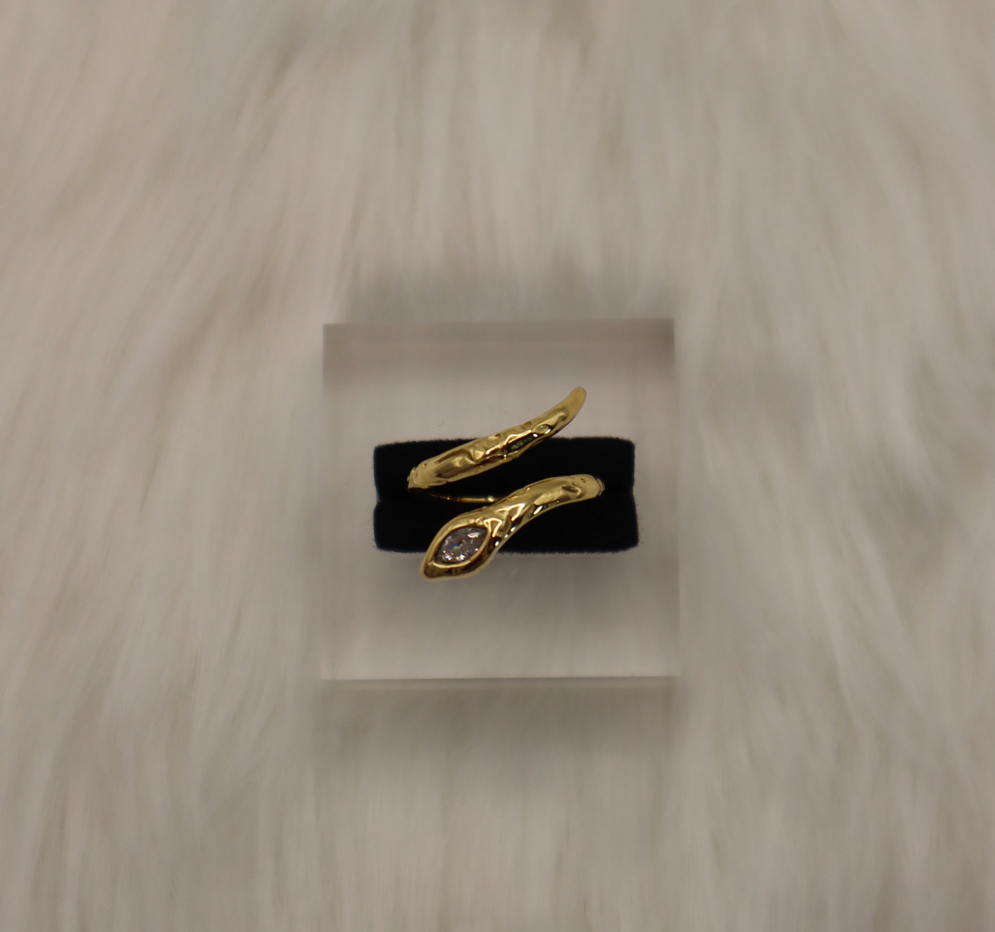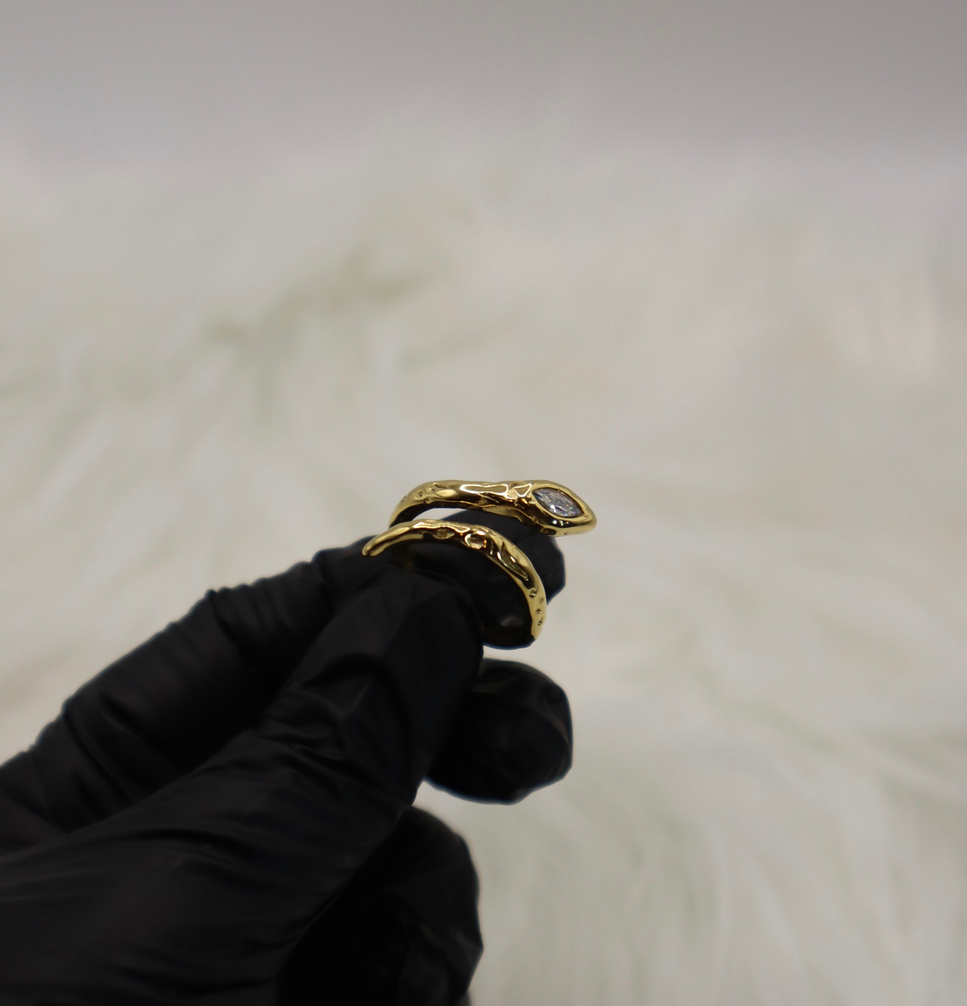 Bold and captivating, the Serpentine Glow Ring coils gracefully around the finger, its textured band is accented by a marquise-cut cubic zirconia that gleams like a watchful eye. A striking piece that radiates power and elegance, perfect for adding an edgy yet luxurious touch to any look.